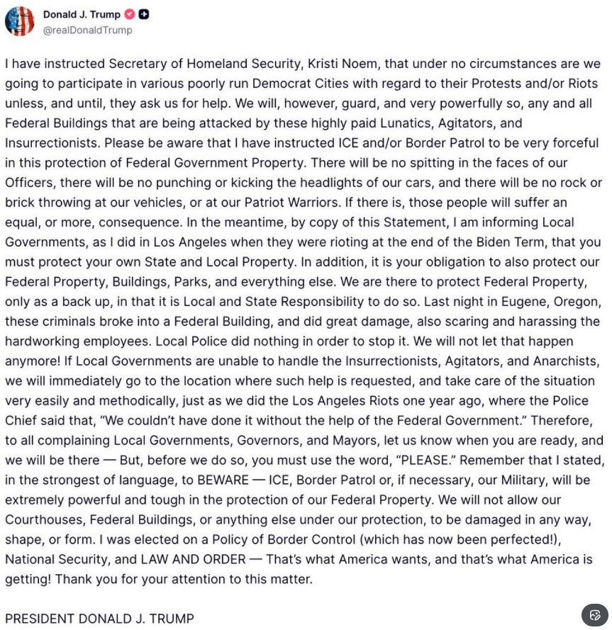 “If Local Governments are unable to handle the Insurrectionists, Agitators, and Anarchists, we will immediately go to the location where such help is requested, and take care of the situation very easily and methodically, just as we did the Los Angeles Riots one year ago, where the Police Chief said that, “We couldn’t have done it without the help of the Federal Government.” “Therefore, to all complaining Local Governments, Governors, and Mayors, let us know when you are ready, and we will be there — But, before we do so, you must use the word, “PLEASE.” Remember that I stated, in the strongest of language, to BEWARE — ICE, Border Patrol or, if necessary, our Military, will be extremely powerful and tough in the protection of our Federal Property.” “We will not allow our Courthouses, Federal Buildings, or anything else under our protection, to be damaged in any way, shape, or form. I was elected on a Policy of Border Control (which has now been perfected!), National Security, and LAW AND ORDER — That’s what America wants, and that’s what America is getting! Thank you for your attention to this matter.”