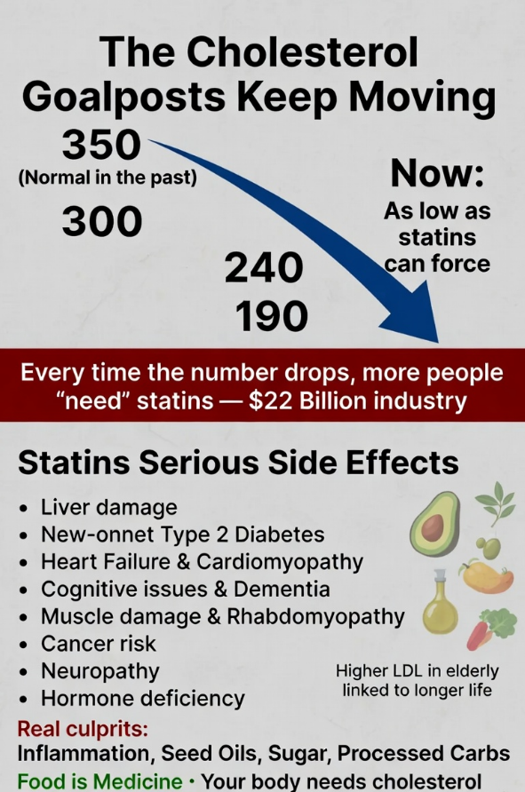 We once considered a Cholesterol Level of 350 perfectly normal & healthy. Then it was lowered to 300. Then to 240. Then to 190. Now doctors want your levels as low as statins can force them — no matter what. Every single time the “safe” number drops, millions more healthy people are suddenly labeled as needing medication. This isn’t medicine. It’s a business model. Statins generate over $22 billion every year. The truth is, the cholesterol hypothesis has been heavily questioned for decades. The famous Framingham Heart Study that helped launch the fear actually showed that for every 1 mg/dL drop in cholesterol per year, there was an 11% increase in both coronary and total mortality.