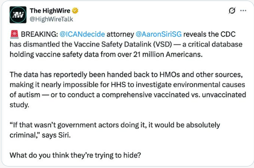 The CDC deleted its vaccine injury database (VSD)—right before RFK Jr. could access it. Getting access to the VSD has been a goal of the vaccine safety community and one of the things RFK pledged to do if he ever assumed office. So rogue HHS employees literally erased the Vaccine Safety Datalink (VSD) to block RFK Jr. from reviewing the data. That’s not a conspiracy theory. It’s completely real. And really crazy. The only reason you would do that is if you have something to hide. So, what were they trying to hide?