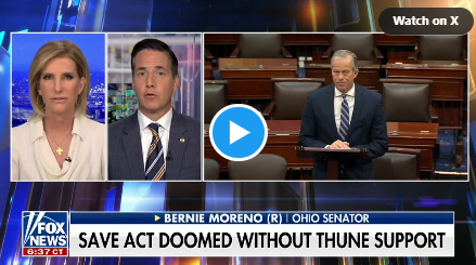 BREAKING: Sen. Bernie Moreno just CONFIRMED there are 3-4 Republican senator holdouts who outright refuse to pass the SAVE America Act through a talking filibuster John Thune apparently has “no leverage” to convince them WE NEED NAMES! Call them out publicly, make them defend it on the floor. MORENO: “[Thune] didn’t hire, he can’t fire these people. Unfortunately, just gonna be blunt — there’s 3 or 4 Republicans who WON’T be part of the team! They row in their own direction.” “Today we had a very spirited conversation…I think we’re getting closer.” “Thune is open to that dialogue. He personally calls some of these senators. But it’s very difficult when you don’t have a lot of leverage.”