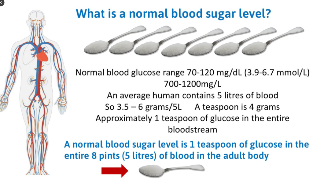 There is remarkably little sugar in your blood ONLY ONE TEASPOON of glucose in your entire bloodstream!! This is why small amounts of carbohydrates put blood sugar up so much if you have T2 Diabetes where insulin is not working properly @CampbellMurdoch I think you gave me this slide