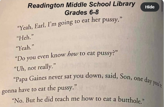 What the absolute hell!? This content is absolutely not for children, yet is in a middle school Library in Readington NJ Why do they want kids to read this? It’s absolutely insane, worst yet, this book Me and Earl and the Dying Girl was challenged and allowed to remain in the library restricted to 8th graders or those presenting maturity How about stop letting smut into our NJ schools resources.finalsite.net/images/v174956