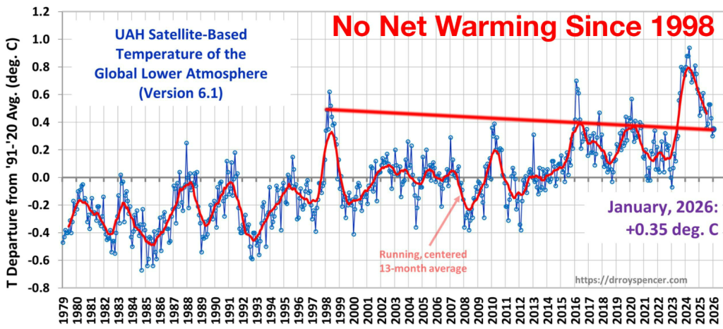 Just in from NASA satellites: No net “global warming” in 28 years. February 2026 was cooler than February 1998. If every emission warms and drives more warming of the planet, how is that possible?