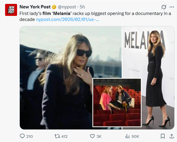 First lady’s film ‘Melania’ racks up biggest opening for a documentary in a decade