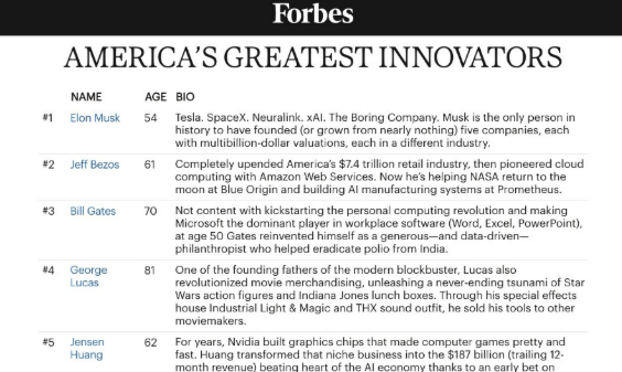 Forbes’ America’s Greatest Innovators (as shown in the post)Here’s the top 10 list extracted from the image in the specified X post: