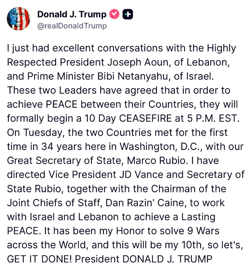 President Trump just spoke with leader of Lebanon and Israel and releases this statement