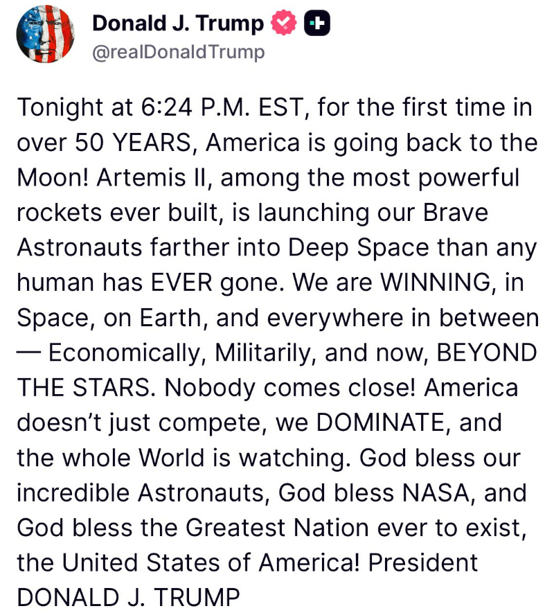 HomeWhatfinger NewsPresident Trump statement on Artemis Launch later today