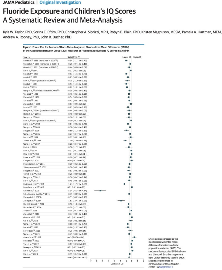 RFK Jr. is correct — for every 1mg/L increase in fluoride in your urine, your IQ score decreases by about 1.63 points. 64 of 74 (86%) studies that looked found fluoride lowers IQ.