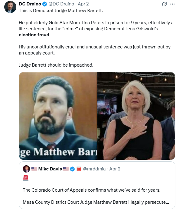 - This is the woman who attempted to intimidate Tina Peters into keeping the image from Mesa County far away from the eyes of the public! The image showed fraud! Jena Griswold would have been able to cover up the blatant CRIMES under her watch if it weren’t for Tina Peters doing the right thing! This is the same woman who leaked BIOS passwords and disregarded her own law after calling Tina Peters a criminal for preserving records! This is the same woman who still says Tina should not be released from prison! Jena Griswold should BE IN PRISON. FREE TINA PETERS – Tina Peters Account on X See below
