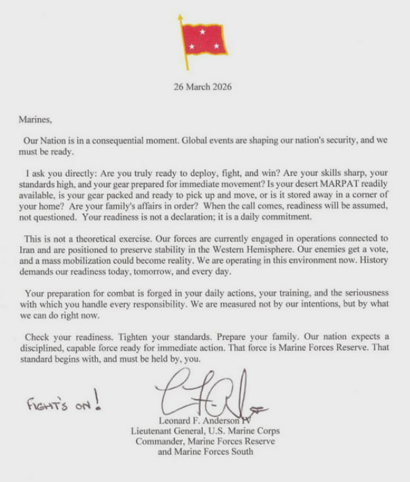 The U.S. Marine Corps just told its reservists (doctors, lawyers, teachers, accountants with weekend warrior training) to check their readiness for possible large-scale mobilisation linked to Iran. “Readiness will be assumed, not questioned.” The active duty Marines just arrived on an amphibious assault ship. Now they’re calling the reserves.
