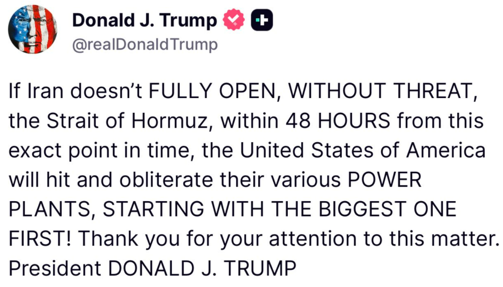 President Trump To Iran – an ultimatum that will be very bad for them on the Strait of Hormuz. They are about to lose their power plants next…
