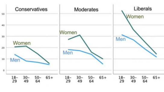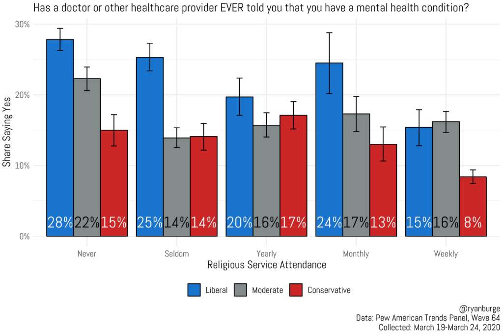 Liberals who have low attendance are the most likely to have a diagnosis.