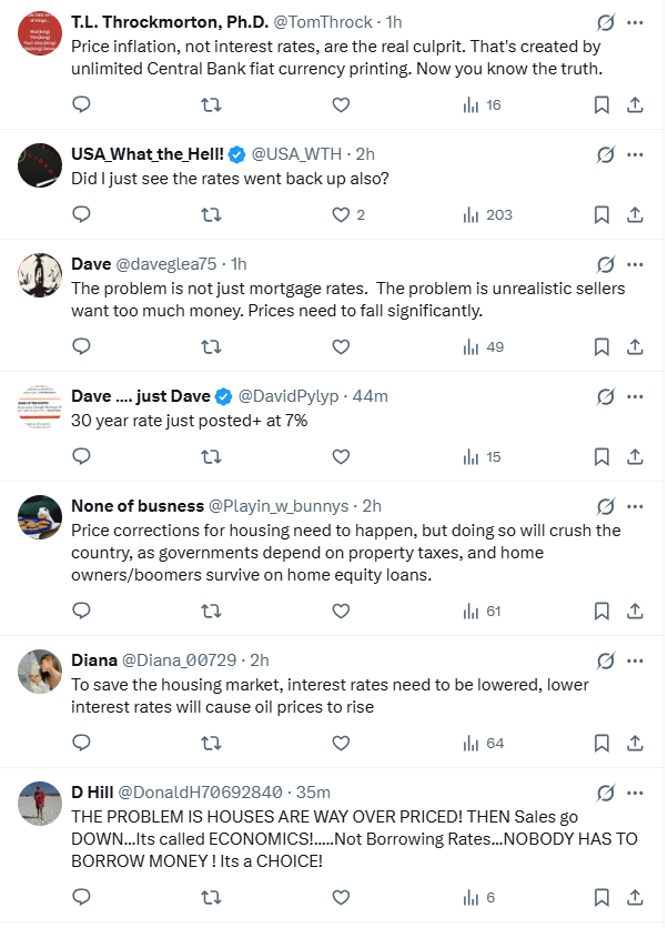 - Peter, the problem isn’t mortgage rates. I see you’re old enough (no offense) to remember when 7% was considered a good rate. The problem is home prices. They need to drop. – Celty