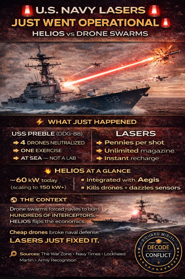 Why this matters: • Missiles cost $1–2M per shot • Lasers cost pennies • Unlimited magazine • Saves interceptors for real threats HELIOS is: • Integrated into Aegis • ~60 kW today (scaling to 150 kW+) • Already software-loaded on 5+ destroyers After decades of promises, directed energy just crossed the line from prototype to operational reality. Cheap drones changed naval warfare. Lasers just changed it back. Sources: The War Zone • Navy Times • Lockheed Martin • Army Recognition