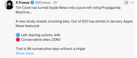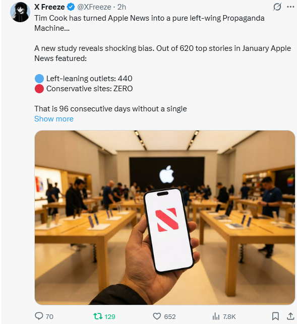 A new study reveals shocking bias. Out of 620 top stories in January Apple News featured: Left-leaning outlets: 440 Conservative sites: ZERO That is 96 consecutive days without a single right-leaning story. Not even one • WaPo: Featured 72 times • NBC: 50 times • Fox, NY Post, Daily Wire: Blacklisted Hundreds of millions of users are being force-fed one-sided narratives He is personally turning 100 million iPhone users into a left-wing echo chamber