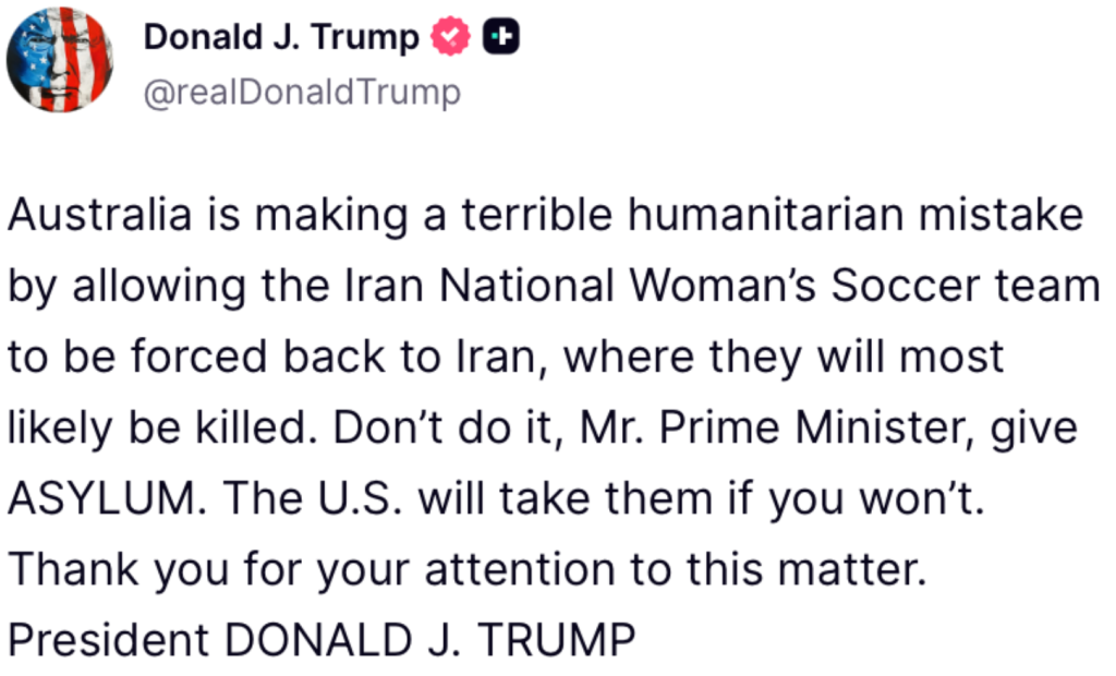 “Australia is making a terrible humanitarian mistake by allowing the Iran National Woman’s Soccer team to be forced back to Iran, where they will most likely be killed. Don’t do it, Mr. Prime Minister, give ASYLUM. The U.S. will take them if you won’t…” –